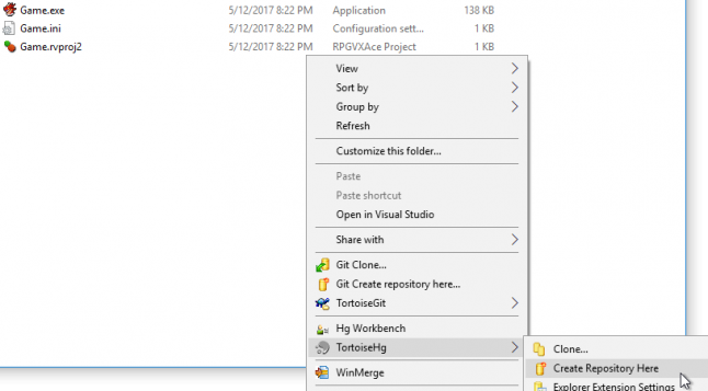 So, let's recap: using TortoiseHg, I've essentially rewound history, reverting the project files on my hard drive to a new, fresh RPG Maker VX Ace project.